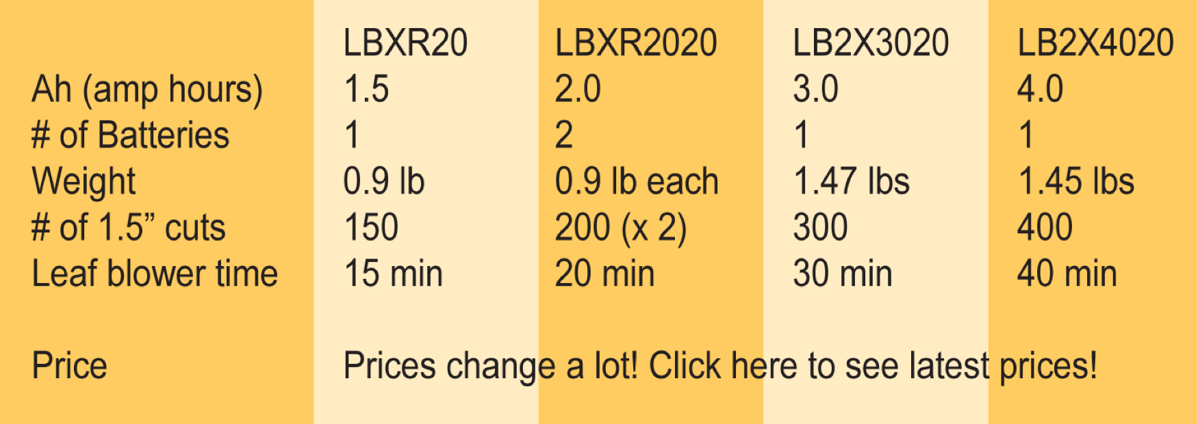 How much power a battery holds is measured in amp hours (Ah). Amp hours tell you how many branches it can cut before the juice runs out. Or it can tell you how long a leaf blower can blow.